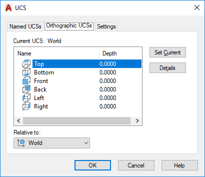 If you save an orthographic coordinate system in a drawing as part of a viewport configuration, or if you select a setting in Relative To other than World, the orthographic coordinate system name changes to Unnamed to distinguish it from the predefined orthographic UCS.