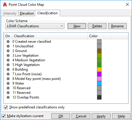 Note: For Intensity, Elevation, and Classification, the stylization is based on the color schemes assigned in the Color Mapping dialog box (POINTCLOUDCOLORMAP). If the required data doesn't exist in the point cloud, the option is grayed out in the stylization dropdown.