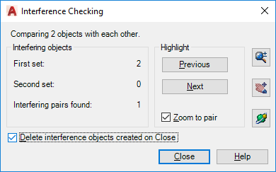 Closes the dialog box and deletes the interference objects if that option is selected.