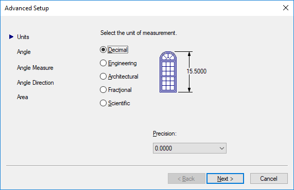 The Advanced Setup wizard contains five pages: Units, Angle, Angle Measure, Angle Direction, and Area. As you work in this wizard, choose Back and Next to navigate between pages; choose Finish on the last page to close the wizard and create the new drawing with the settings you specified.
