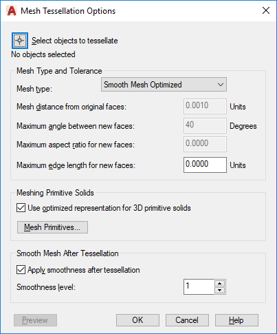 The defaults that you set in the Mesh Tessellation Options dialog box control the appearance of objects that you convert to 3D mesh objects. For a complete list of objects that can be converted to mesh, see the MESHSMOOTH command.