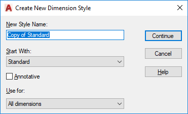 Names the new dimension style, sets the style on which to start the new one, and indicates the dimension types to which you want the new style to apply.