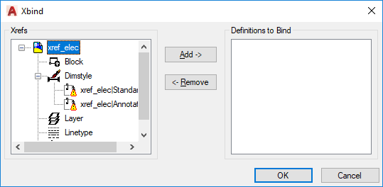 Moves the named object definitions selected in the Xrefs list into the Definitions to Bind list.