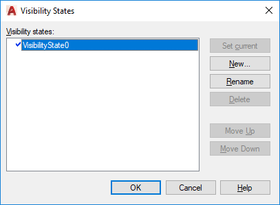 Lists the available visibility states for the current dynamic block definition. The order of this list is reflected in the dynamic block reference when the grip is clicked to display the list of visibility states. The state at the top of the list is the default state for the block reference.