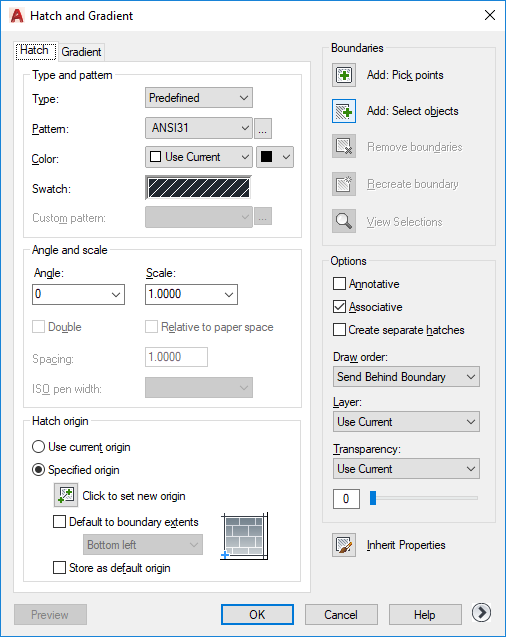 The Hatch and Gradient dialog box has two tabs and some common options that are available from both tabs.