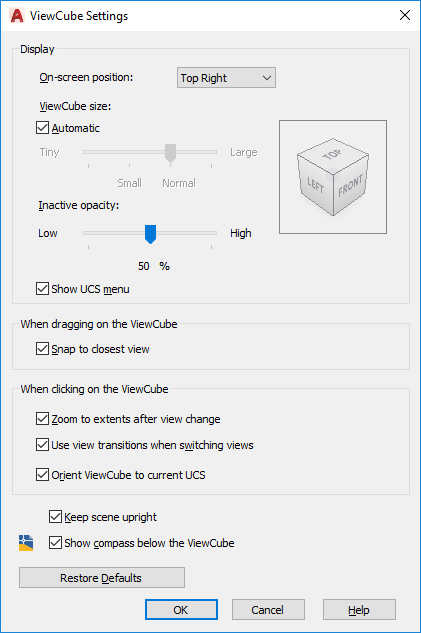 Select Automatic to have the size of the ViewCube tool adjust based on the current size of the active viewport, zoom factor of the active layout, or drawing window.