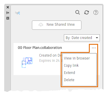 Initiates the process creating a new shared view. Displays the Share View dialog box providing several options. Next, data is extracted from the drawing to create a view, and this view is temporarily posted on a location in your Autodesk Web & Mobile Account, and a link to that location is generated, which you can share.