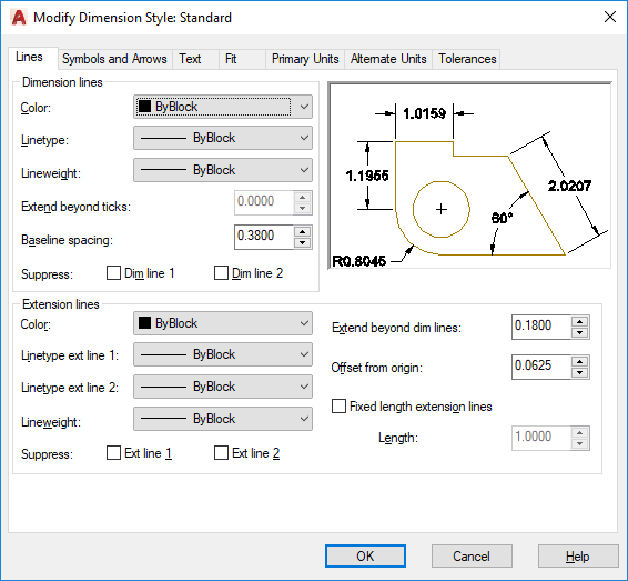 Sets the format and properties for dimension lines, extension lines, arrowheads, and center marks.