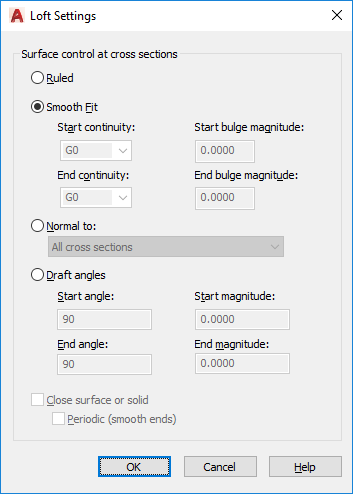 Controls the draft angle and magnitude of the first and last cross sections of the lofted solid or surface. The draft angle is the beginning direction of the surface. 0 is defined as outward from the plane of the curve. (LOFTNORMALS system variable)