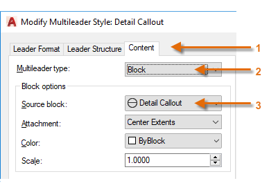 For example, to create a "detail callout" style, start the MLEADERSTYLE command. In the Multileader Styles Manager, click New and choose a descriptive name for the new multileader style. Click the Content tab, choose Block, and then Detail Callout as shown.