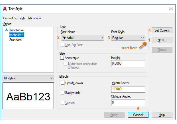 When you create a new text style, you give it a name, and then choose a font and a font style. The order in which you click the buttons is shown below: