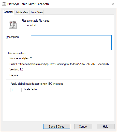 Lists the plot style table file name, description, version number, location (path name), and table type.