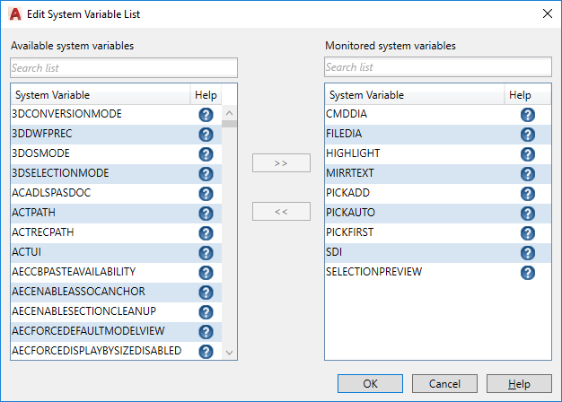 You can select or search for a system variable to be added or removed from the monitored system variables list.