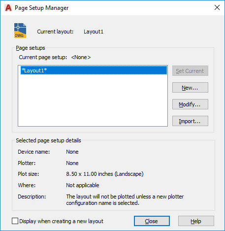 You can also create named page setups, modify existing ones, or import page setups from other drawings.