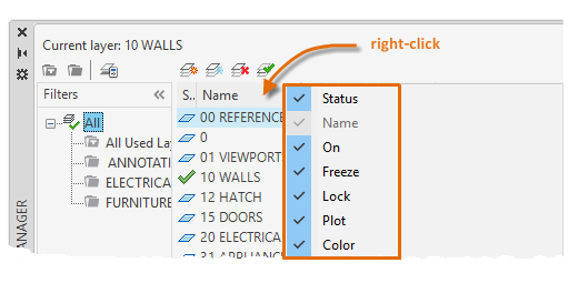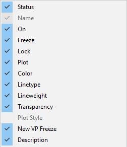 Lists all columns by name. A check mark indicates that the column is included in the display. Click a column name to display or hide the column. VP Freeze, VP Color, VP Linetype, VP Lineweight, and VP Plot Style are available only when a layout viewport is active.