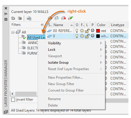 Removes the selected layer filter. You cannot delete the All, All Used Layers, or Xref layer filters.