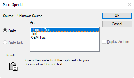 Inserts a picture of the application icon instead of the data. To view or edit the data, double-click the icon.
