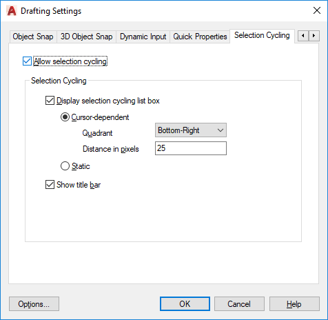 Selection cycling allows you to select objects that are overlapping by pressing Shift + Spacebar. You can control whether a blue cursor icon displays to indicate overlapping objects and you can configure the display settings of the Selection list box.