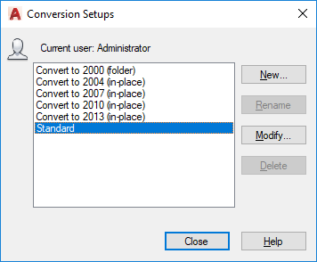 Renames a conversion setup that appears in the list. Only conversion setups that you have created can be renamed. The Standard conversion setup cannot be renamed.