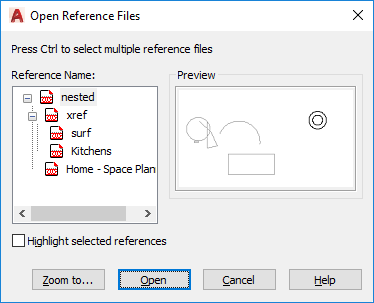 Temporarily closes the Open Reference Files dialog box and zooms the view in the drawing area to the selected reference. Press Enter to redisplay the dialog box.