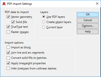 PDF geometric data types include linear paths, Beziér curves, and solid-filled areas, which are imported as polylines, and 2D solids or solid-filled hatches. Within a tolerance, curves that resemble arcs, circles, and ellipses are interpolated as such. Patterned hatches are imported as many separate objects.