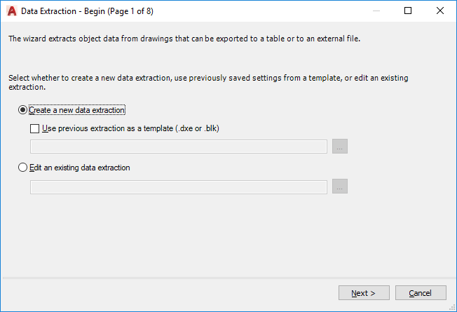 Creates a new data extraction and saves it to a DXE file. You can also specify a previous extraction file (DXE or BLK) to use as a template file.