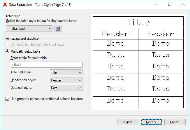 Controls the appearance of the data extraction table. This page is displayed only if AutoCAD Table is selected on the Choose Output page.