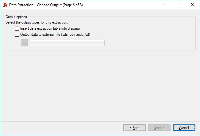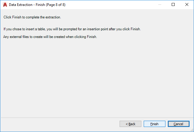 Creates a table that is populated with extracted data. You are prompted to insert the table into the current drawing when you click Finish on the Finish page.