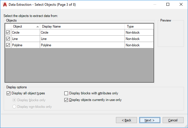 Specifies the types of objects (blocks and non-blocks) and drawing information to be extracted.