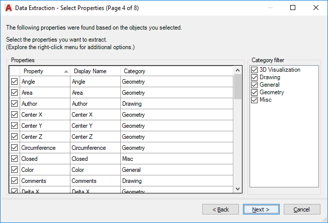 Displays a list of categories that are extracted from the property list. Unchecked categories filter the Properties list. Categories include 3D Visualization, Attribute, Drawing, Dynamic Block, General, Geometry, Misc, Pattern, Table, and Text.
