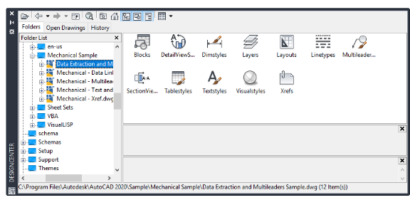 When you click the Folders tab or the Open Drawings tab, the following two panes are displayed from which you can manage drawing content: