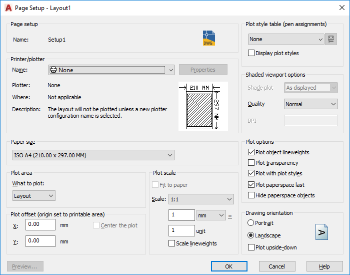 • Preview: Sets rendered and shaded model space views to be plotted at one quarter of the current device resolution, to a maximum of 150 dpi.