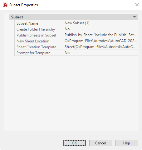Specifies the drawing template (DWT) file and layout name that is used to create new drawing files for this subset.
