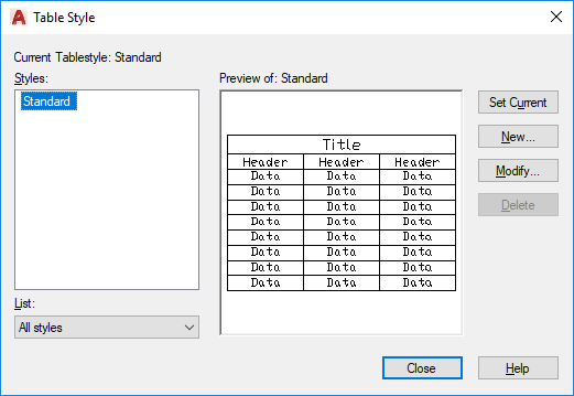 Deletes the table style selected in the Styles list. A style that is being used in the drawing cannot be deleted.