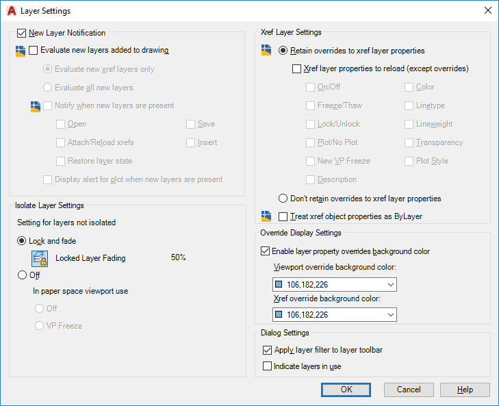 Controls when notification occurs for new layers, layer behavior when some layer are isolated, whether layer filters are applied to the Layers toolbar, and the background color of viewport overrides in the Layer Properties Manager.