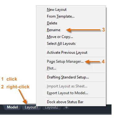 The first thing that you should do when you access a layout tab (1) is right-click the tab (2) and rename it (3) to something more specific than Layout 1. For a D-size layout, ARCH D or ANSI D might be a good choice.