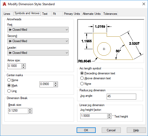 The DIMCENTER, DIMDIAMETER, and DIMRADIUS commands use center marks and centerlines. For DIMDIAMETER and DIMRADIUS, the center mark is drawn only if you place the dimension line outside the circle or arc.