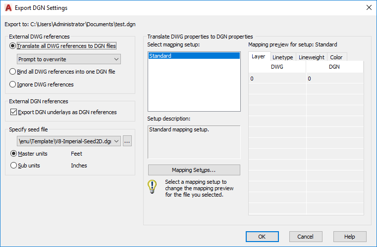 A seed file for a DGN file is similar to a drawing template (DWT) file that contains default settings and attributes, such as working units. Selecting the appropriate DGN seed file (imperial, metric, or user-defined), and conversion units is critical to the translation from DWG to DGN. In addition, the seed file contains settings that are not present in a DWG file, and therefore inherited in the exported DGN.