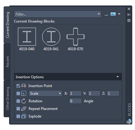 Tip: You can remove a block displayed in the Recent tab by right-clicking it and choosing the Remove from Recent List option. To remove all blocks displayed in the Recent tab, temporarily set the BLOCKMRULIST system variable to 0.