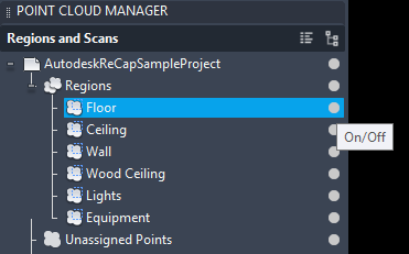 In ReCap, you can combine point cloud scans into a project, and you can select areas of the combined point cloud and define them as regions. In AutoCAD, the Point Cloud Manager lets you view and manage point cloud projects, regions, and scans that were created in ReCap prior to being imported and attached to a drawing. To display the Point Cloud Manager, a point cloud attached to a drawing must be open and selected.
