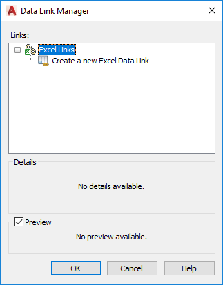 Lists the Microsoft Excel data links within the drawing. If the icon displays a linked chain, then the data link is valid. If the icon displays a broken chain, then the data link is broken.