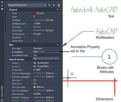 Annotation objects include dimensions, notes, and other types of explanatory symbols or objects commonly used to add information to your drawing.