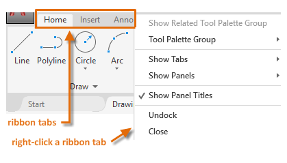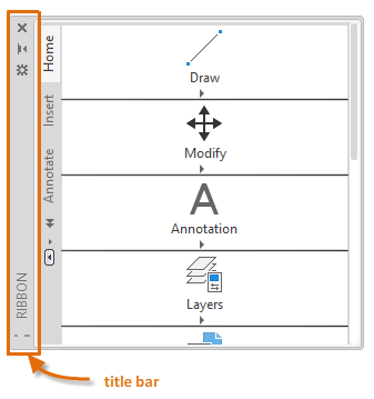 - Click the title bar and drag the undocked ribbon to either the left edge, right edge, or top of the drawing area