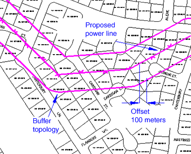 Use Buffer Analysis to show an area around an existing topology. In this case, the buffer analysis of the power line network topology creates a new polygon topology.