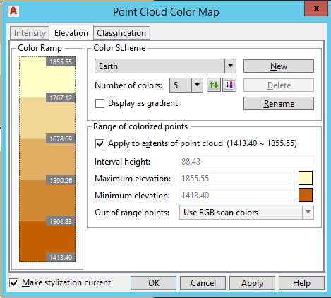 Point Cloud Color Map dialog box. If the required data doesn't exist in the point cloud, the option is grayed out in the stylization drop-down.
