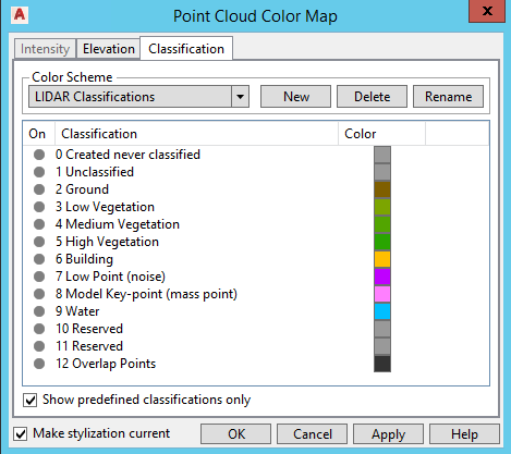 Note: For Intensity, Elevation, and Classification, the stylization is based on the color schemes assigned in the