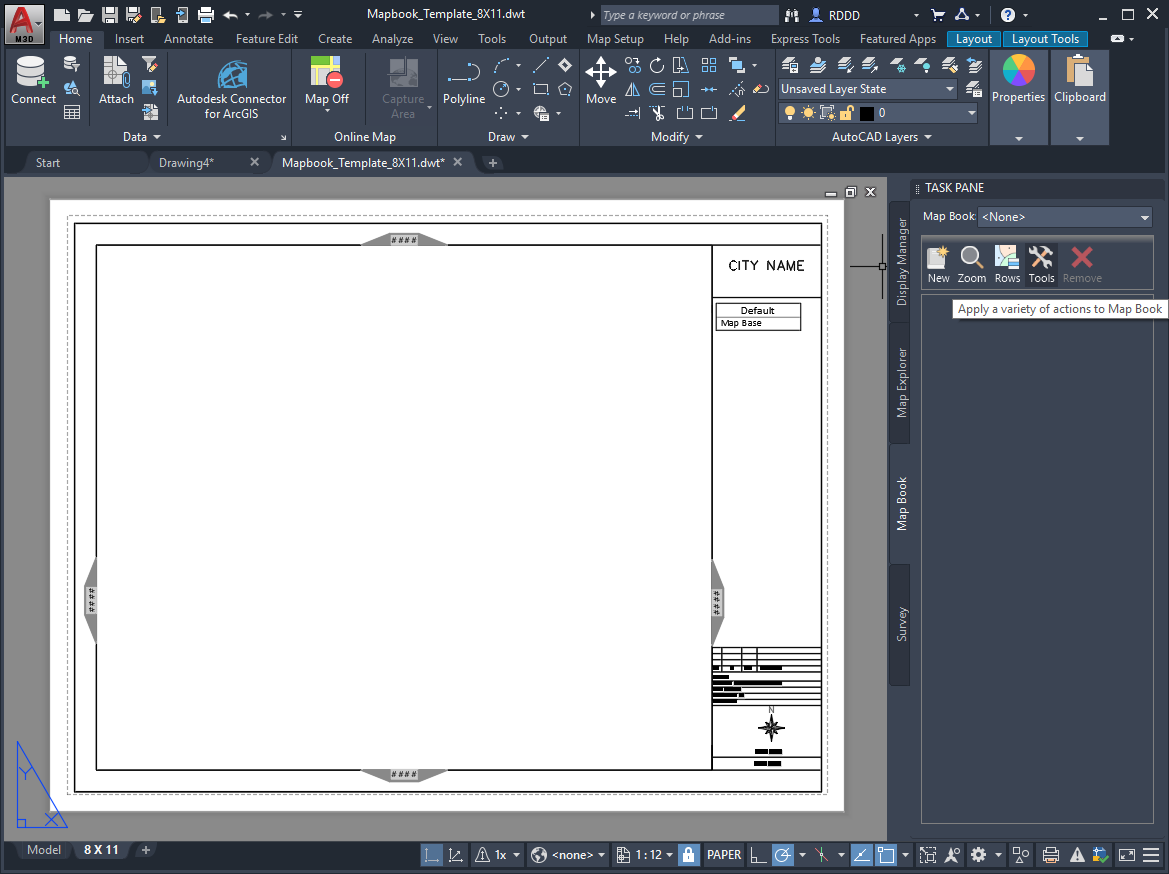 - Title block displays a defined DWG block that can include title information, such as your company or group name and the name of the map. Many organizations have standard title blocks to insert in this element. You can define certain attributes of the title block from within your template. Title blocks defined in the sample templates include a frame that surrounds the entire tile. When you generate the map book, you can choose a drawing for the title block. That drawing replaces the original title block contents defined in the template layout.
