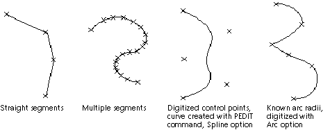 - When digitizing irregular curves with PLINE or MAPDIGITIZE, the spacing of the selected vertex points should depend on the curvature of the line. Straighter segments require fewer points.