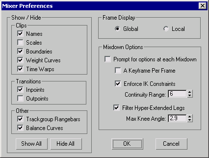 The options in the Mixdown Options group determine if and how the mixdown affects transitions between clips with planted feet. Enforce IK Constraints affects planted feet, while Filter Hyper-Extended Legs affects unnaturally straight legs. Turn on Prompt for options at each Mixdown if you want to be asked for these settings each time you do a mixdown. For more information on these options, see Mixer Preferences Dialog.
