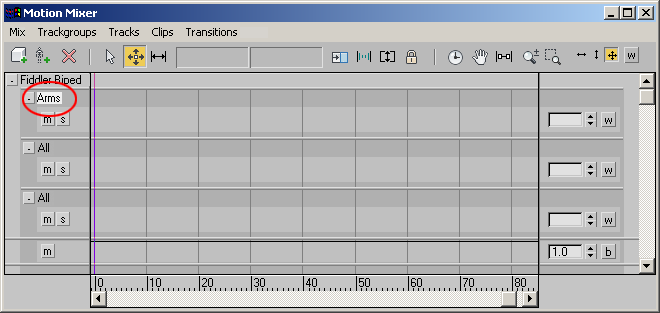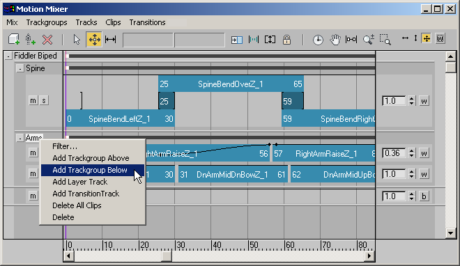 When a trackgroup is created, it is given one Layer track by default. However, you can add more tracks to each trackgroup, making it possible to mix motions for each set of body parts. For example, you could create a trackgroup for the arms, and have two tracks within this trackgroup. Then you could put two completely different sets of motions on each track, and use weighting to use one track or the other at different times during the motion. See Adjusting Track Weight.
